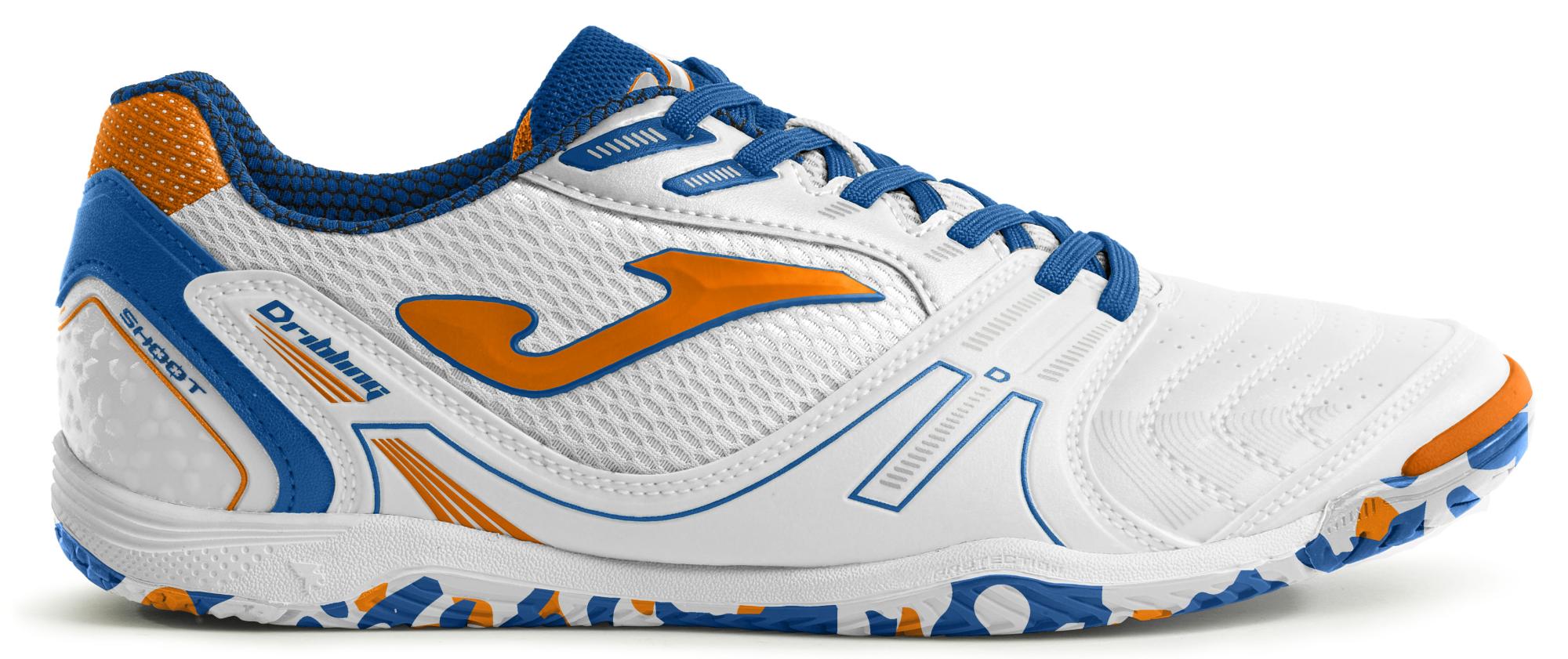 Joma Dribling, футзалки, верх которых изготовлен из прочного и гибкого синтетического материала Fibertec (искусственная кожа). Боковые части выполнены из сетчатого текстиля, отвечающего за доступ воздуха. Мягкий текстильный материал применен во внутренней части верха. В области носка в материале также имеются вентиляционные отверстия (система VTS), благодаря которым стопа игрока все время матча или тренировки остается сухой. Усиленная пятка и носок защищают от повреждений. Дополнительный защитный элемент в носочной области помогает наносить сильные удары по мячу. Подошва DRIBLING выполнена из износостойкой резины (технология DURABILITY) , обеспечивающей отличный контракт с игровой поверхностью. Точка разворота ROTATION помогает легко и без риска травмы изменять направление движения на паркете. Линии FLEXO делают футзалки гибкими и способствуют естественному движению стопы по время бега. Технология PERFECT FIT, используемая в зоне шнуровки, обеспечивает оптимальную посадку кроссовок.