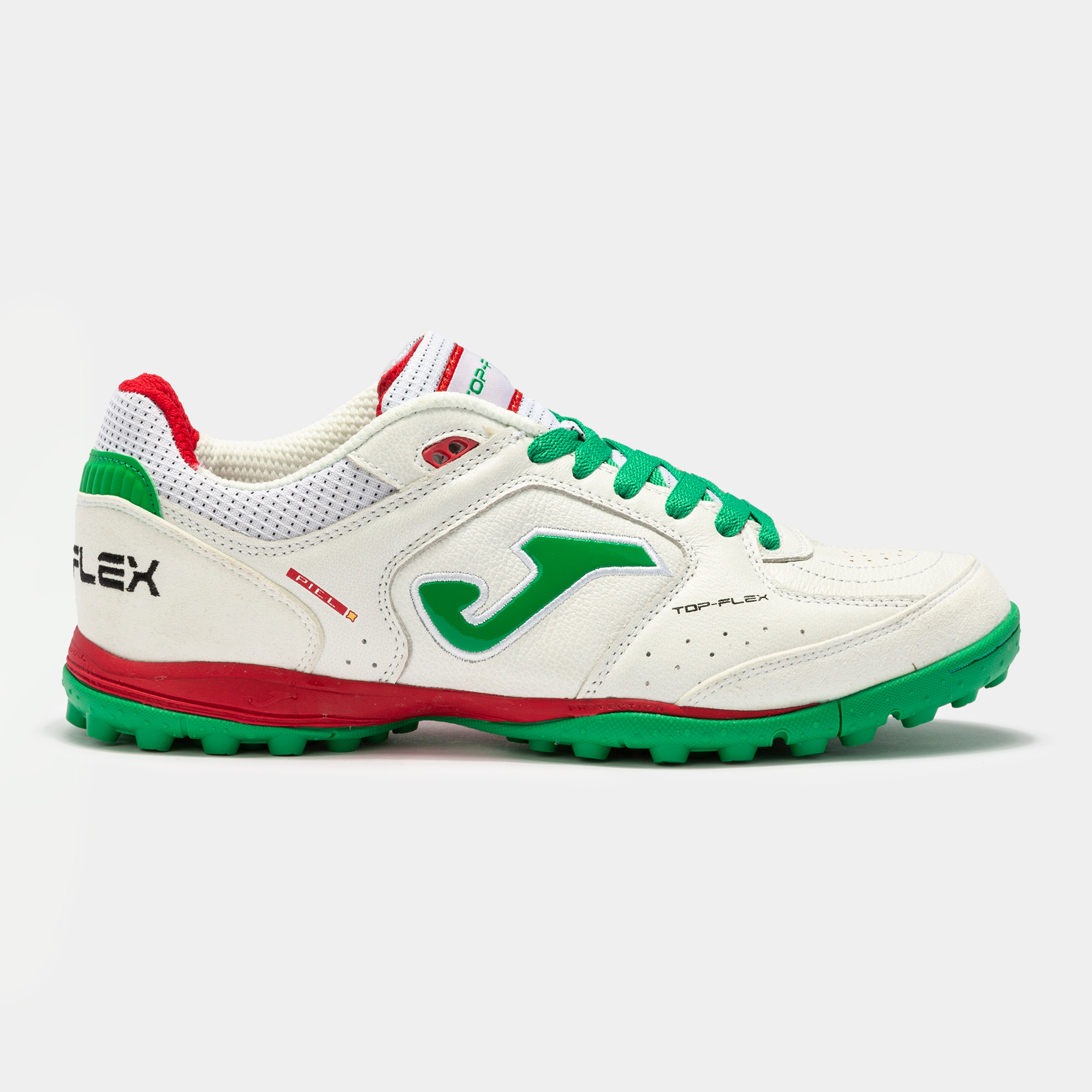 JOMA TOP FLEX — одна из самых известных моделей турфов (сороконожек), которую выбирают профессиональные футболисты. Верх турфов из прочной и очень гибкой кожи, которая обеспечивает контроль мяча и воздухопроницаемость. В тех местах обуви, где требуется дополнительная вентиляция, предусмотрена система VTS, способствующая воздухообмену. Для плотной посадки изнутри добавлен текстильный материал. В этой модели улучшена защита носка, а для усиления амортизации в промежуточной подошве использован современный синтетический материал филон. Подошва из износостойкой резины дольше сохраняет свои качества.