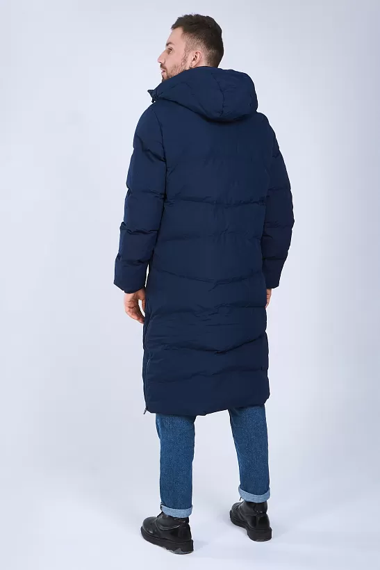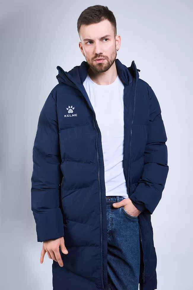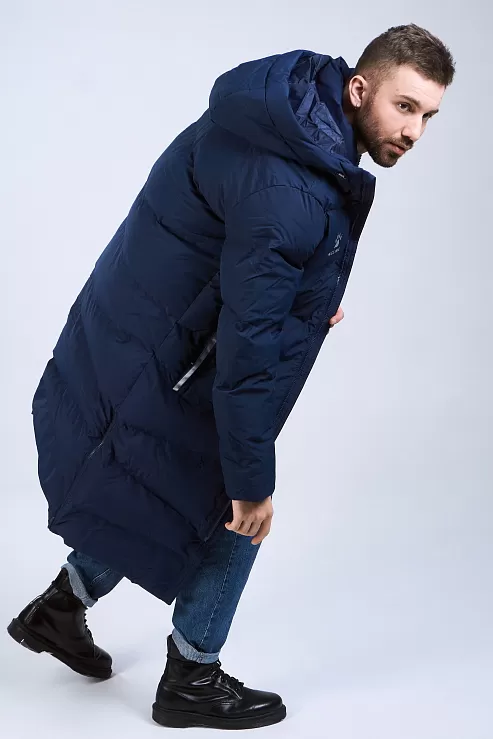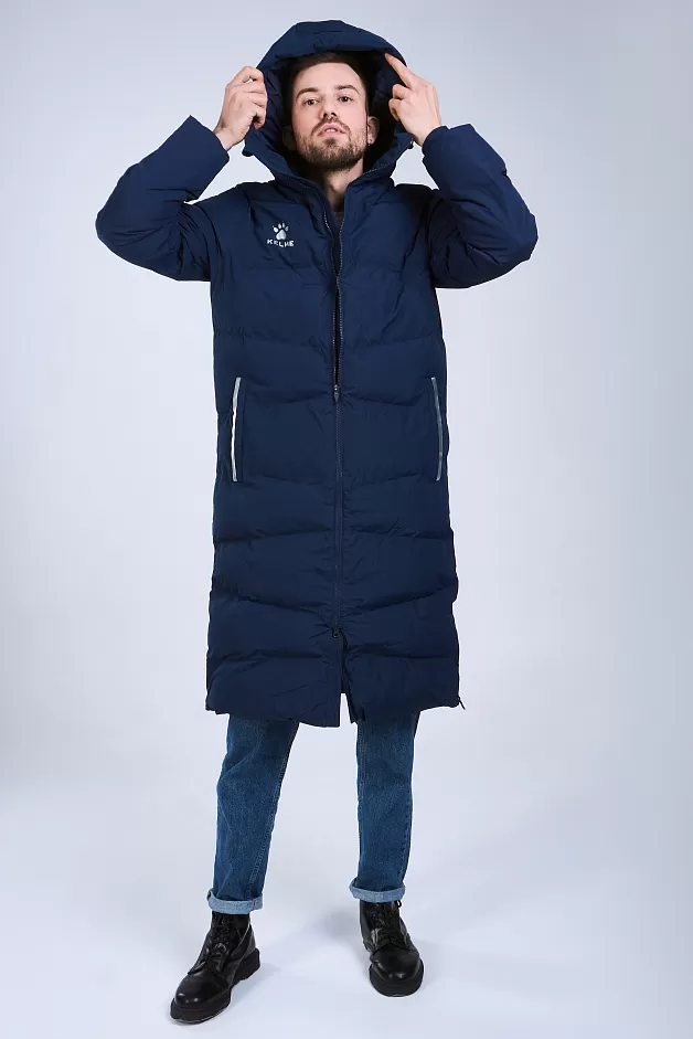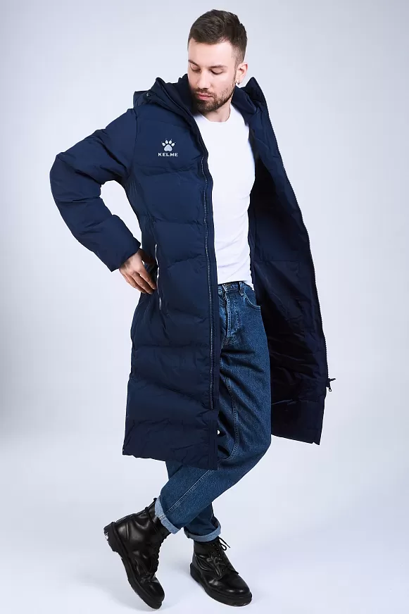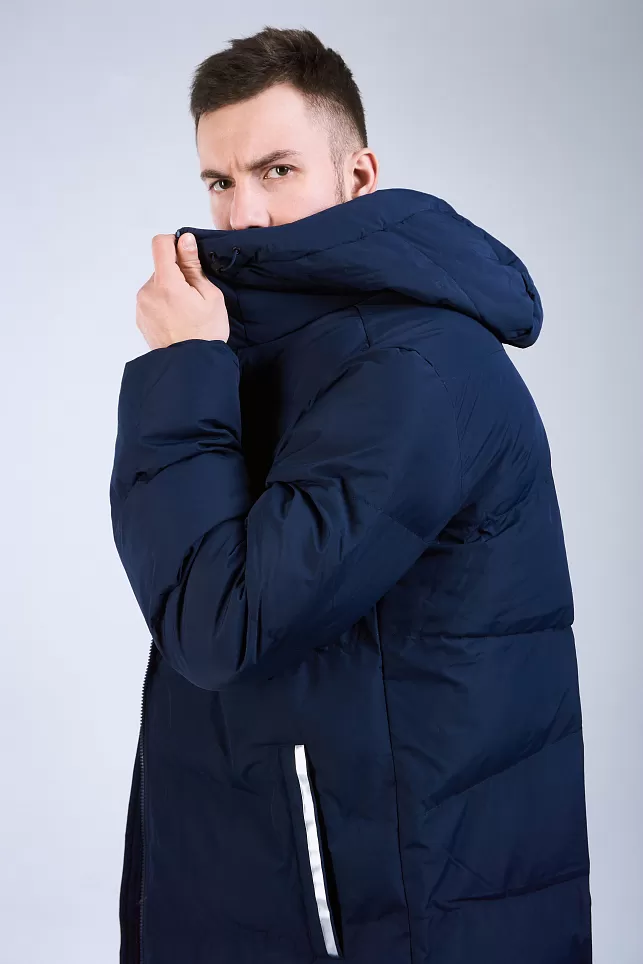 Длинная теплая куртка с капюшоном, с двойной молнией, из 100%-го, легкого и прочного полиэстера. Материал не промокает и отлично защищает от ветра, способствует отведению излишнего тепла и влаги. Манжеты рукавов на резинке способствуют сохранению тепла. Капюшон с кулиской с зажимами для дополнительного комфорта. В куртке два боковых кармана на молнии и один внутренний на липучке. По бокам, в нижней части куртки, добавлены две молнии, для регулировки посадки. Модель отличает лаконичный дизайн: куртка однотонная с контрастными логотипами и полосами по краям боковых карманов.